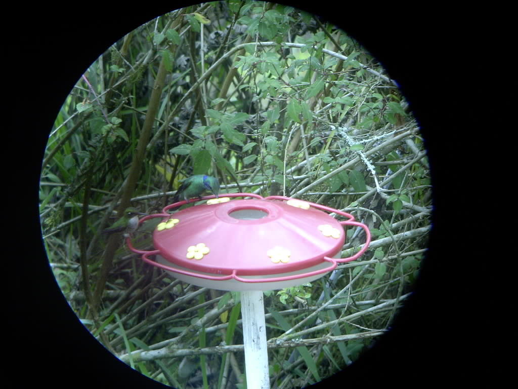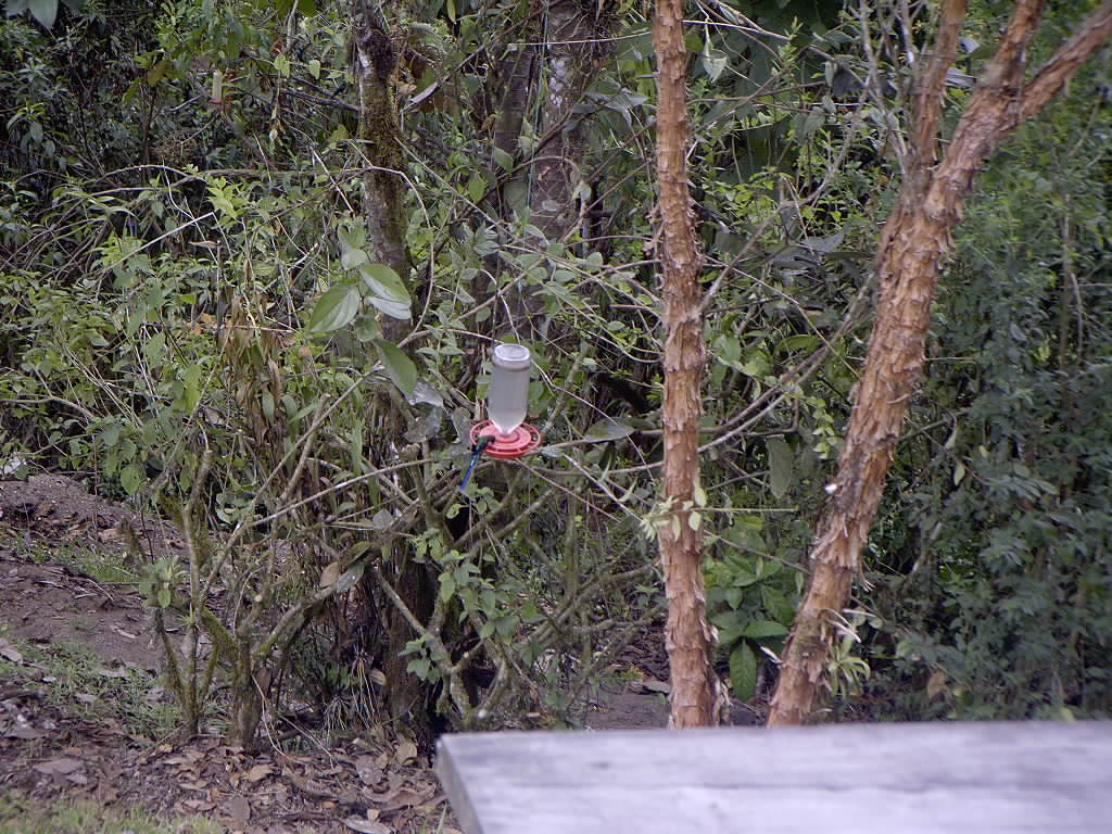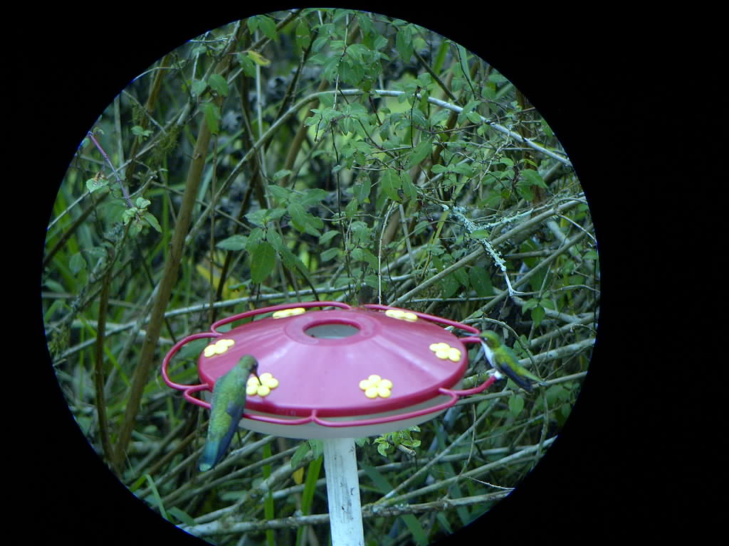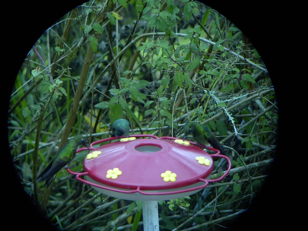 We travelled north and west of Quito about an hour and a half to the home of Tony Nunnery. There we were able to identify 24 species of hummingbirds in their back yard. Tony and his wife Barb were both there and Tony spent the afternoon sitting with us on the porch telling us all about each species of hummingbirds we saw. They were all over the place. He said his record for the most number of species in one day is 26. He said he and his wife Barb have identified 28 different species of birds from their back porch. This includes all birds. They have identified 38 different species of hummers at their feeders and have identified 5 more species of hummers out in the forest that surrounds them. This is the highest concentration of hummingbirds in the world. We were enthralled with all the activity. At any one time the bushes and trees along with the feeders were just alive with motion from all the birds. We probably saw way over 100 hummers at any one time without a doubt. They would come right up to you and buzz around at our feet as they were working the feeders off the porch. Many times we would see the feeders full with others hovering and waiting. They were eating so fast that the air would bubble up into the reservoir of the feeders. Tony went out one time to fill them while we were there. They have to fill them several times a day. He has probably between 20 to 30 feeders in his back yard and they all were busy all the time. At one time a hawk or some bird of prey came in close and the hummers gave a warning chirp and suddenly there were no hummers at all. They were in the trees and bushes and you could see them but they remained totally still and motionless. They stayed that way for several minutes until the danger was over and then out they came and were back to the busy activity all over the feeders and the flowers in the bushes. It was truly a fascinating thing to watch. We were there for about 3 hours and enjoyed every minute of it. Phyl especially enjoyed watching all the hummers. Makes her two hummers seem ho-hum. In talking with Tony about the hummers we have at our feeder at home he got out a book that showed pictures of them. What we have is a male and female. Tony brought out this spotter telescope and would focus in on a feeder. I could then put my camera up to the lens and take a really good close up picture of the hummers. I got several pictures that way. That was really neat.