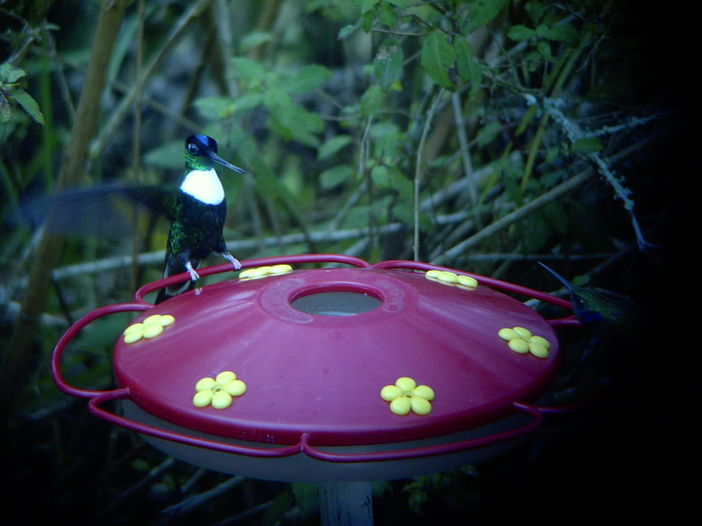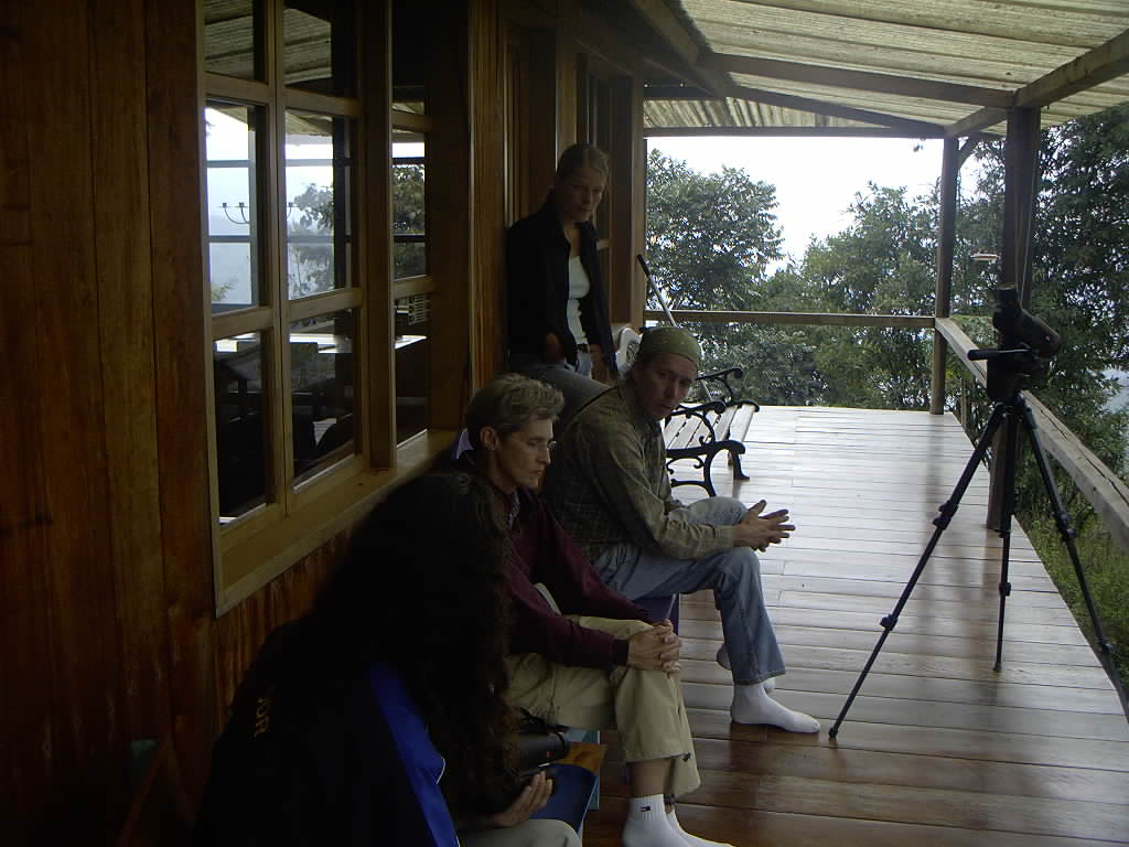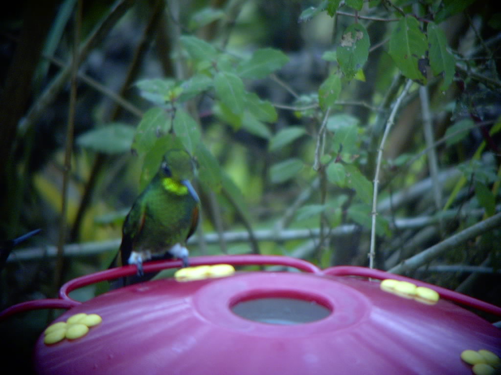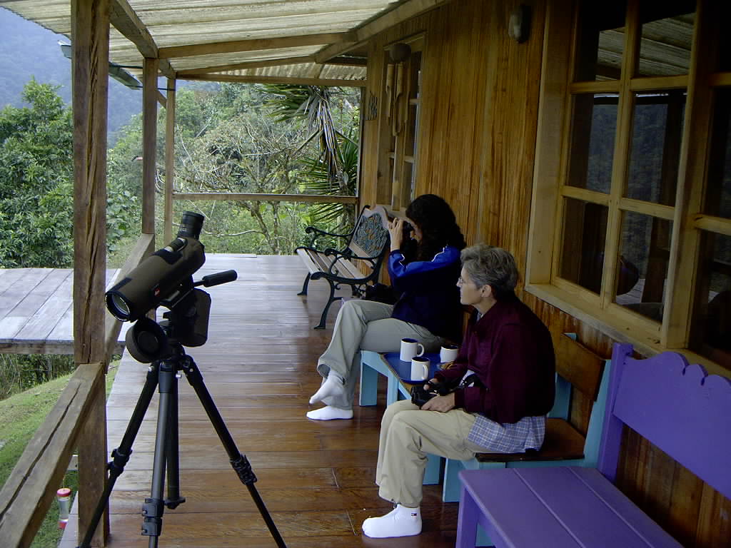 We travelled north and west of Quito about an hour and a half to the home of Tony Nunnery. There we were able to identify 24 species of hummingbirds in their back yard. Tony and his wife Barb were both there and Tony spent the afternoon sitting with us on the porch telling us all about each species of hummingbirds we saw. They were all over the place. He said his record for the most number of species in one day is 26. He said he and his wife Barb have identified 28 different species of birds from their back porch. This includes all birds. They have identified 38 different species of hummers at their feeders and have identified 5 more species of hummers out in the forest that surrounds them. This is the highest concentration of hummingbirds in the world. We were enthralled with all the activity. At any one time the bushes and trees along with the feeders were just alive with motion from all the birds. We probably saw way over 100 hummers at any one time without a doubt. They would come right up to you and buzz around at our feet as they were working the feeders off the porch. Many times we would see the feeders full with others hovering and waiting. They were eating so fast that the air would bubble up into the reservoir of the feeders. Tony went out one time to fill them while we were there. They have to fill them several times a day. He has probably between 20 to 30 feeders in his back yard and they all were busy all the time. At one time a hawk or some bird of prey came in close and the hummers gave a warning chirp and suddenly there were no hummers at all. They were in the trees and bushes and you could see them but they remained totally still and motionless. They stayed that way for several minutes until the danger was over and then out they came and were back to the busy activity all over the feeders and the flowers in the bushes. It was truly a fascinating thing to watch. We were there for about 3 hours and enjoyed every minute of it. Phyl especially enjoyed watching all the hummers. Makes her two hummers seem ho-hum. In talking with Tony about the hummers we have at our feeder at home he got out a book that showed pictures of them. What we have is a male and female. Tony brought out this spotter telescope and would focus in on a feeder. I could then put my camera up to the lens and take a really good close up picture of the hummers. I got several pictures that way. That was really neat.