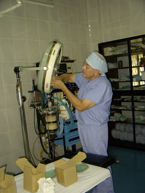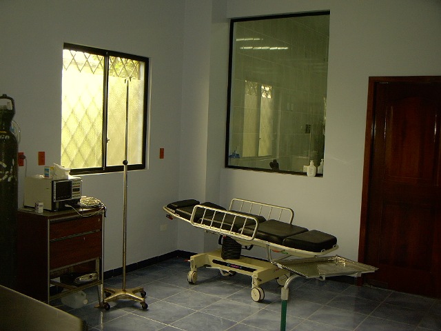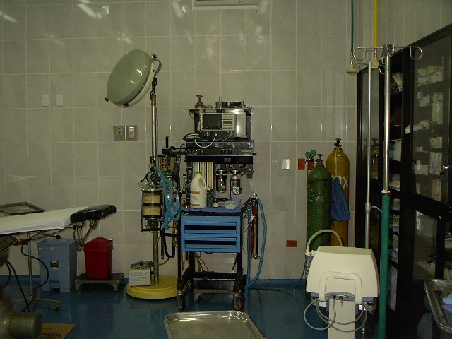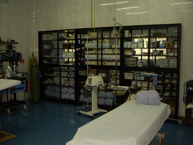 A view of the operating room with the large supply shelves that form the wall between the OR and the sterilization room. There are glass doors on both sides to allow access to the shelves from either room. This allows much better organization of the supplies and makes taking inventory a easier process.