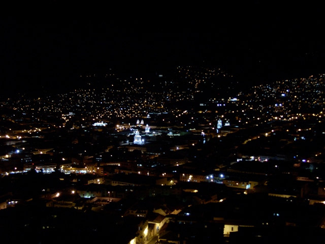 A view of Quito from the restaurant balcony. The spires of several churches are illuminated and stand above the rooftops of the other buildings.