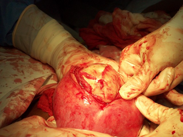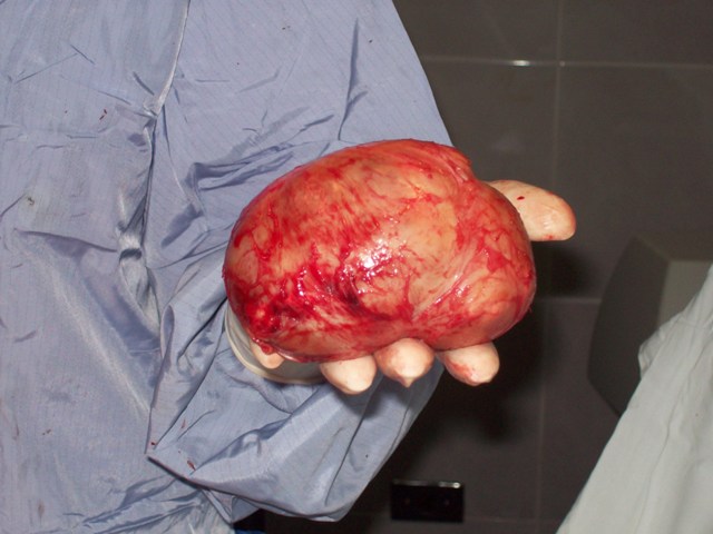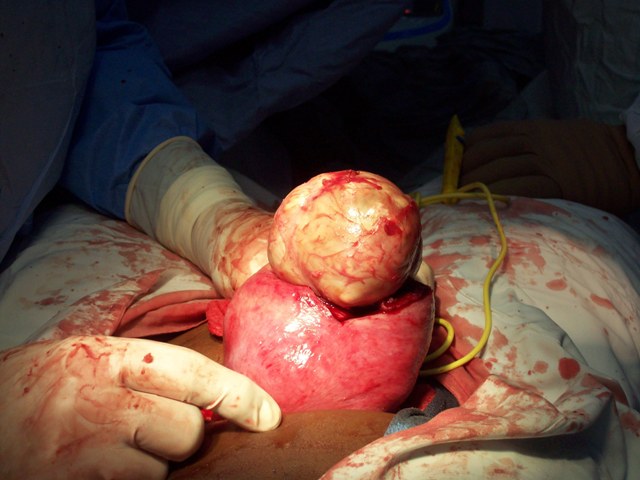 This patient was a young lady with multiple fibroids and wants to conceive. We performed a myomectomy procedure removing one large fibroid and four smaller ones. The pictures here show the process of removing the large one.