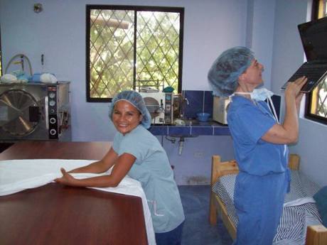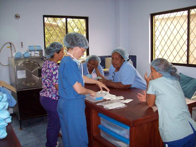 Jane trying to get an Internet signal, Carmen folding surgical drapes
