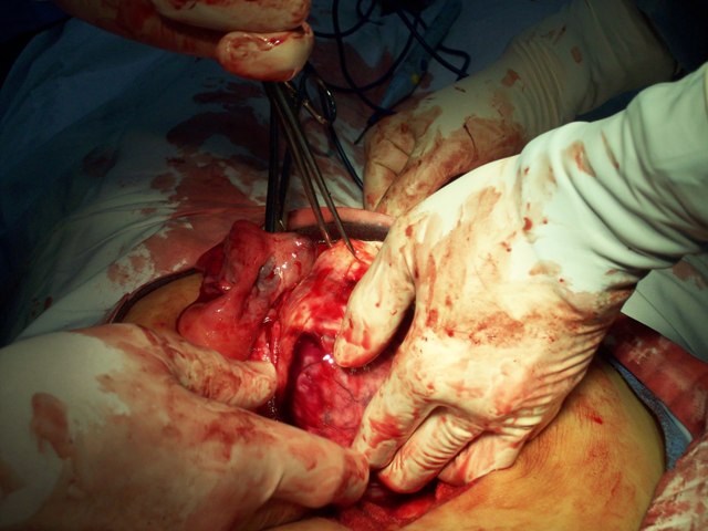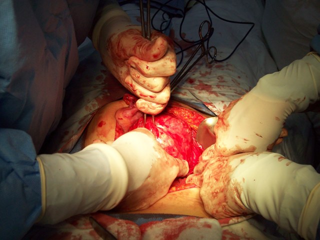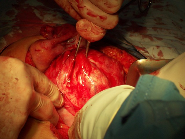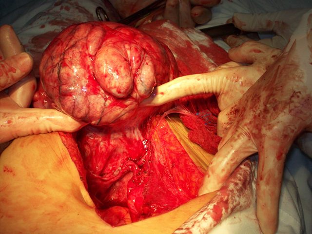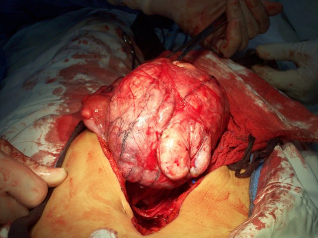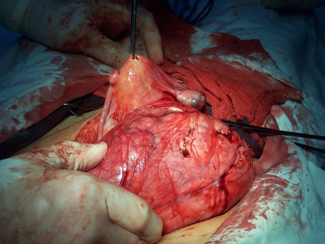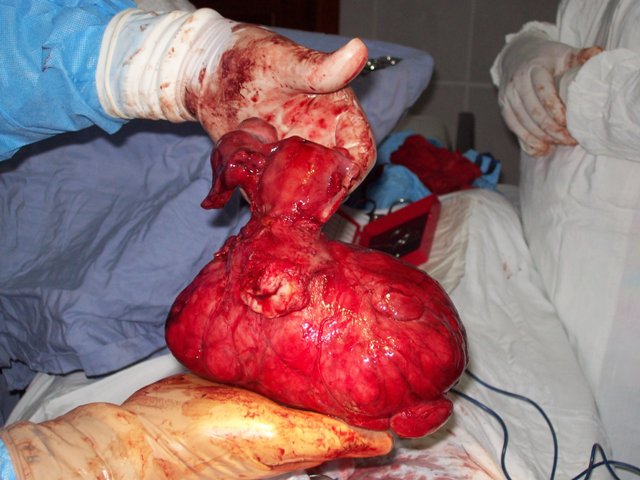 Uterus and mass removed intact. Uterus is in my left hand, mass in the right