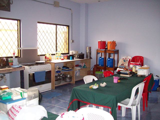 Inside the new building the first room is the kitchen/lounge area. We have all our meals here and also gather here for meetings, devotions and board games in the evenings.