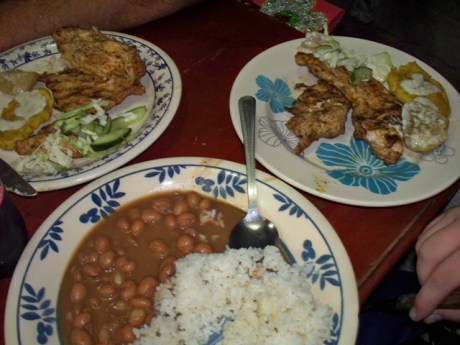 Dinner consisting of typical Ecuadorian food: grilled meat, beans and rice.