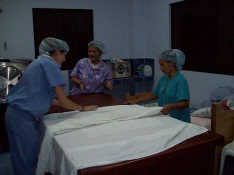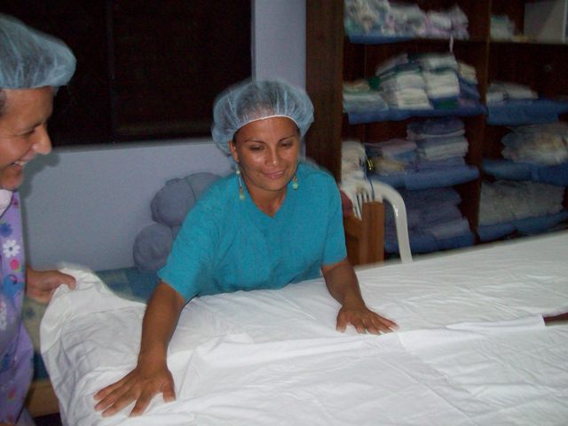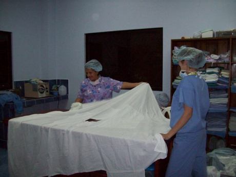 Yesterday I took some pictures of Carmen, Damarys and Elizabeth folding drapes for surgery.  After laundering them Carmen will then fold them in specific ways so they can be unfolded on the OR table and not moved around afterwards.  The drapes must unfold in a certain direction to help preserve the sterile field.  The drapes are folded and then wrapped and sterilized all on site.