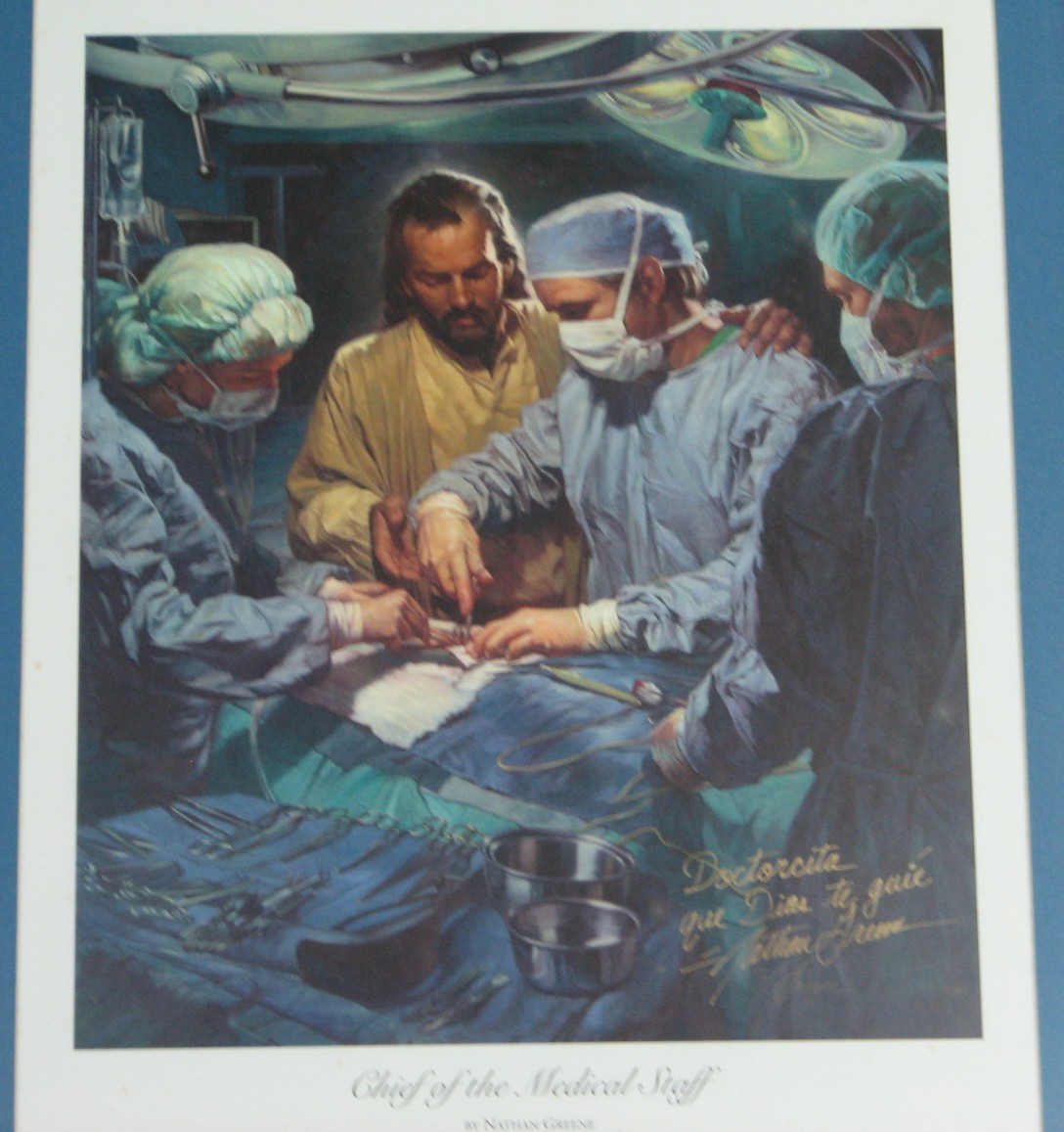 Jane has a picture hanging on the wall in the OR that means so much to me. It is a picture produced by artist Nathan Greene and is titled Chief of the Medical Staff. It shows what we experience working here. Even though He may be invisible to our eyes, we know and feel His presence with us as we operate. I know He is standing with us much like the picture depicts and at times He wraps His hands around ours and guides us as we do surgery. I love this picture and I find it so meaningful to me. This is the only operating room I have been in that has this picture on display. It is a good reminder of why we are here and Who we are really serving.