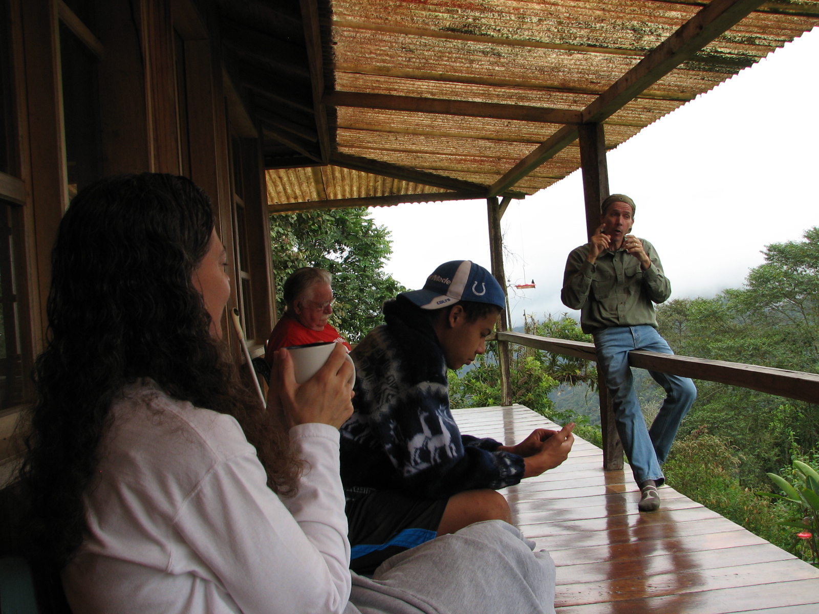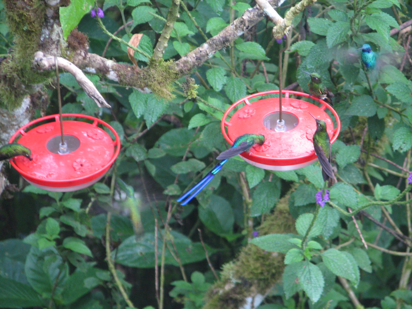We had lunch in one of the restaurants and then left to drive about an hour out from Quito to an area called the cloud forest. At this area there are tall mountains covered with trees, tropical plants and grass. Tony and Barb Nunnery live here and have developed an area on the side of the mountain where they have built a home and built a hummingbird preserve. Their back yard has several hummingbird feeders and these feeders were busy, sometimes with 6 or more birds feeding at once. This area has the highest concentration of hummingbirds in the world. Tony has identified 42 different species of hummingbirds in his back yard. We spent the afternoon sitting on their back porch talking with Tony and Barb and enjoying the conversation. Tony told about the history of the place, how he acquired the land, built the house and wanted to develop a sanctuary for the hummingbirds since there were so many. This involved planting flowering bushes that hummingbirds like as well as putting up multple feeders. He has developed hiking trails all around the area where one can stroll and see hummingbirds in their natural habitat. Watching these hummingbirds was truly fascinating. I kept thinking about God’s creativity and how much fun He must have had making all these different kinds of beautiful birds. Tony said the hummingbirds must eat about every 15 minutes. At night their metabolism slows down to the point the birds are in a stupor so they can rest without having to eat all the time. We talked about the ruby throated hummingbirds we see in Indiana at our feeders and how they migrate. He said they migrate south to Mexico and Panama and will fly across the Gulf of Mexico, over 300 miles, in one flight. He said it is amazing and science has yet to explain how this little bird that is no bigger than one’s thumb can fly that distance without stopping or needing to feed. Amazing how God designed these birds!