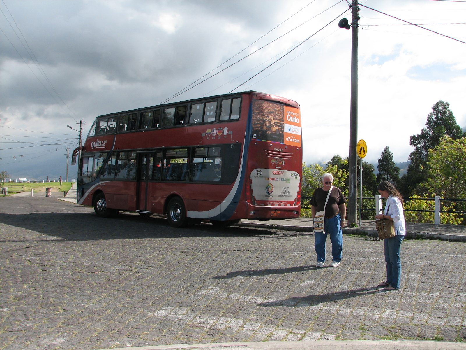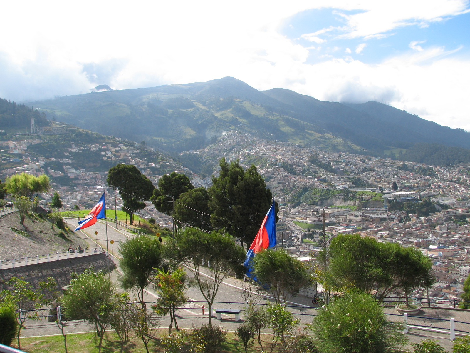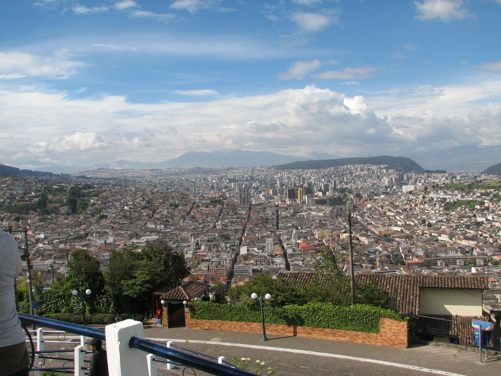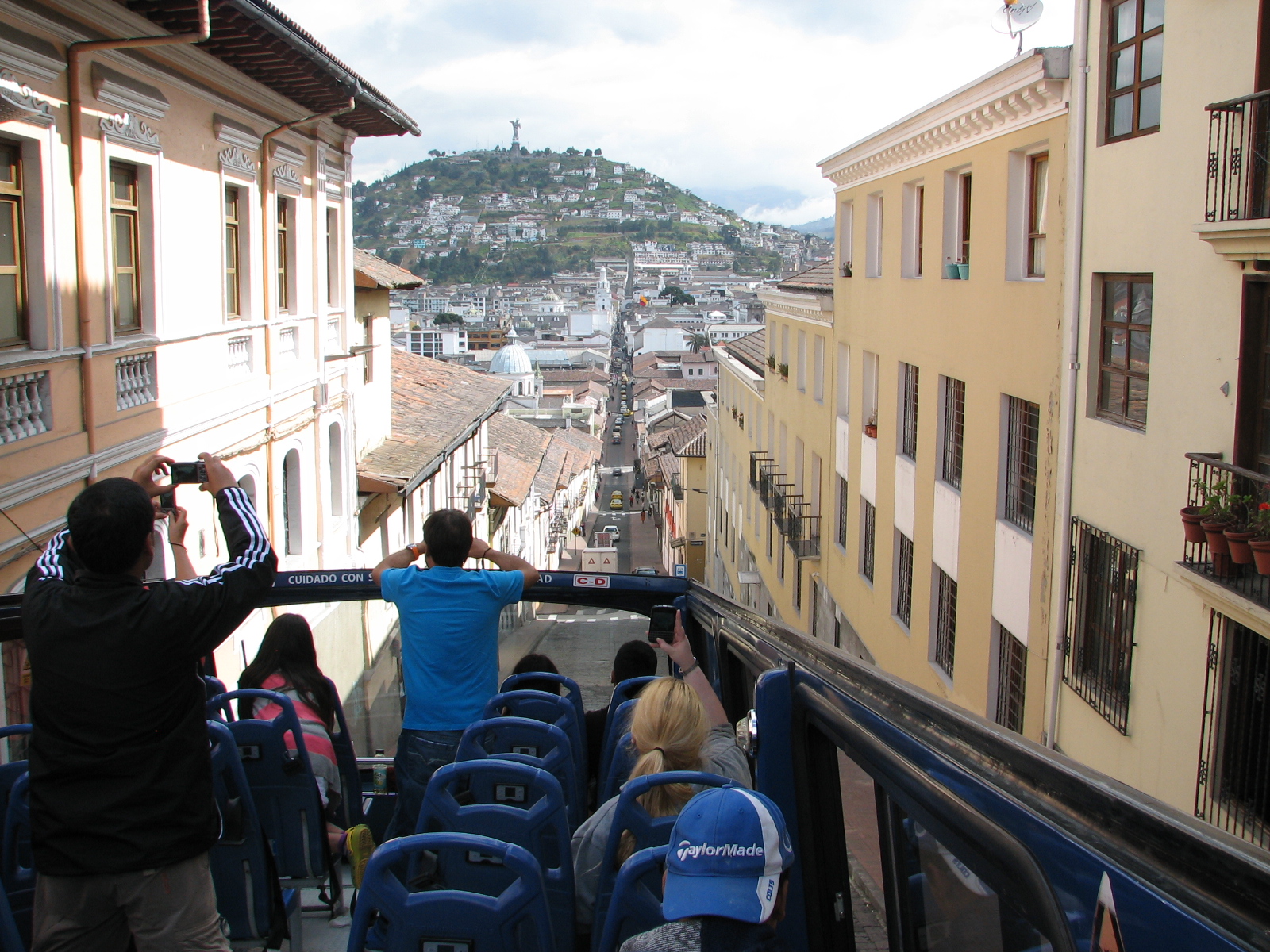We got on the tour bus about 2 pm and enjoyed a 3 hour adventure going through the old city where the streets were so narrow the bus took up the entire street. This was a double decker bus so we sat on the top level. As we went through some of the streets the awnings over the windows came very close to the bus. The tour was narrated in English and Spanish and we learned a lot of history of this city of 2 million plus. Jane was telling me that Quito is 4 miles wide and about 26 miles long. The houses are packed in next to one another with no yards or grass. There were people everywhere.