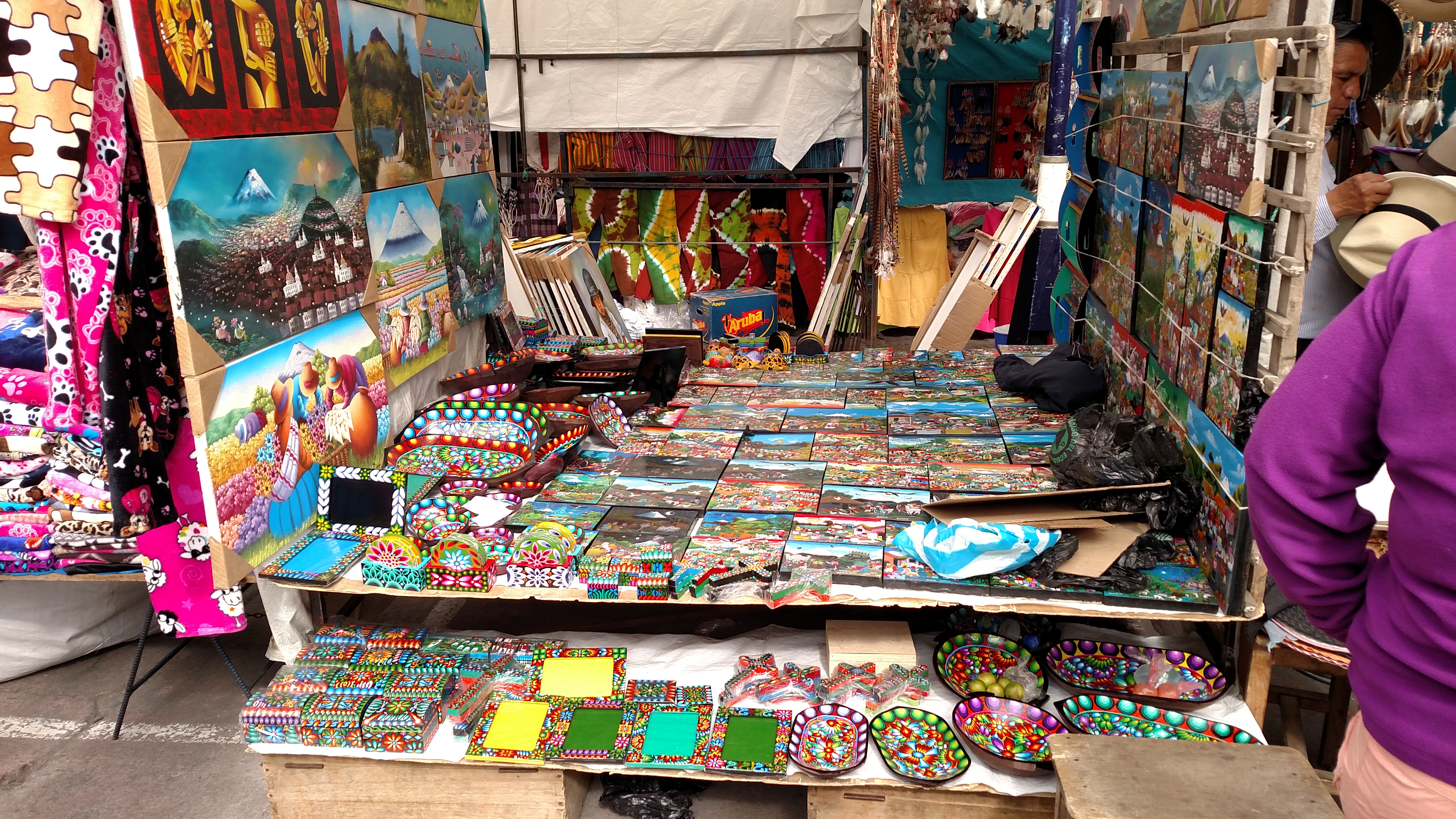 Otavalo market was packed. There is a large open square in the center of town where the Quichua Indians sell their wares. The square is at least a city block square if not larger. It was packed with tables and vendors as well as all the side streets had vendors extending from the square in all directions. There were all sorts of handmade weavings, clothing, necklaces and jewelry, carvings in wood and jade, tagua carvings (vegetable ivory) and other items. It is a very interesting place just to browse but it would be difficult to walk away without buying something. This market is supposedly one of the main attractions for the country of Ecuador and tourists come from all over just to experience this place. We shopped and picked up special items for our families and friends. While there we stepped into a small coffee shop that also had a sandwich and soup menu and had lunch.