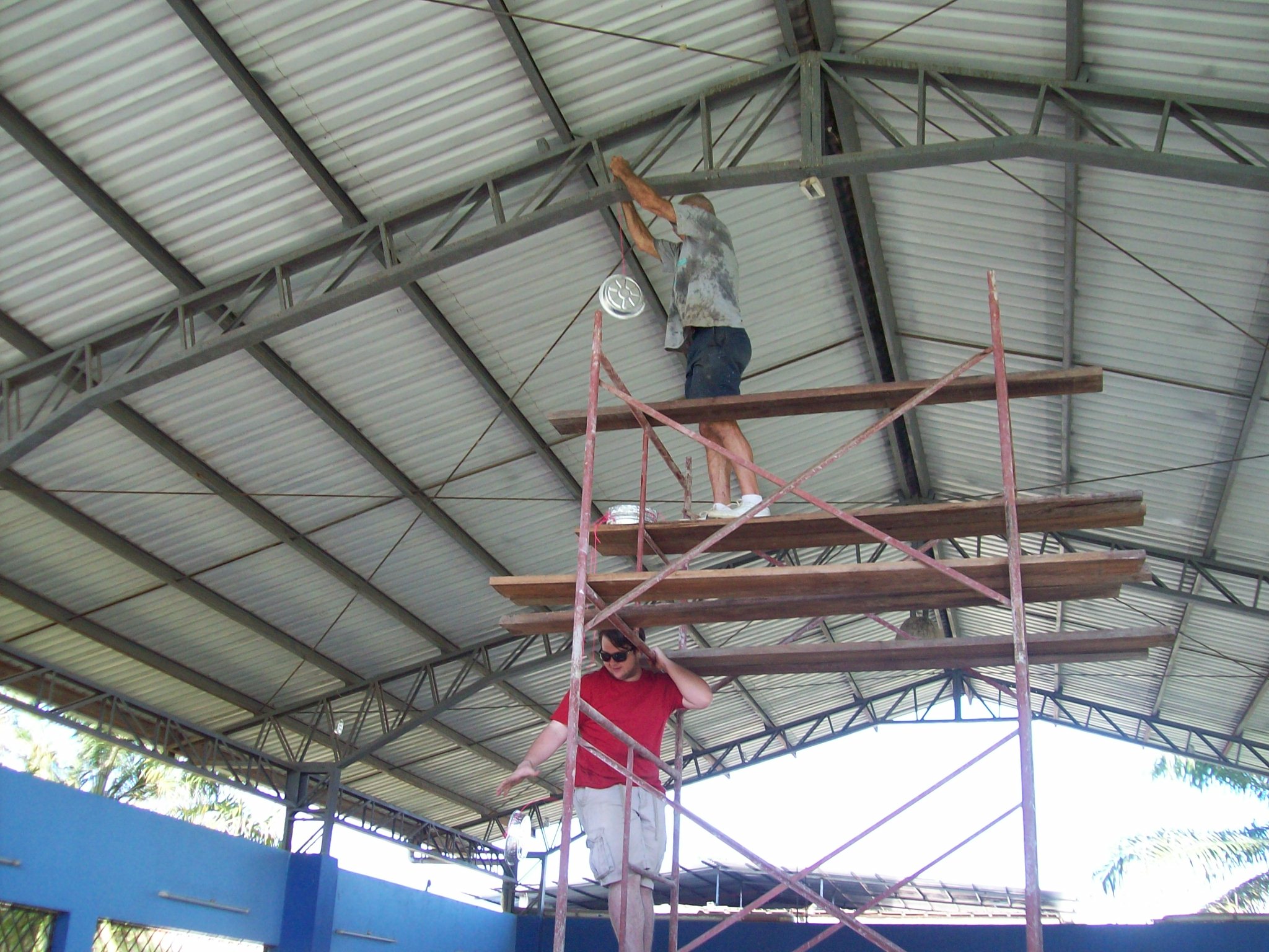 This morning Ted and Howard busied themselves by hanging aluminum pie pans from the rafters in the ministry building. This building has an open roof with open gables at each end and open soffits. Recently pigeons have been flying in and roosting on the rafters and creating a huge mess on the floor. Jane emailed me shortly before coming here to see if I could bring some aluminum pie pans. She wants to hang them from the rafters in that the pigeons will likely not want to be close to them and thus will stay out of the ministry building. Ted and Howard put together some scaffolding and Ted climbed up to hang the pie pans. Katie helped by stringing the pans and then Howard passed them up to Ted.