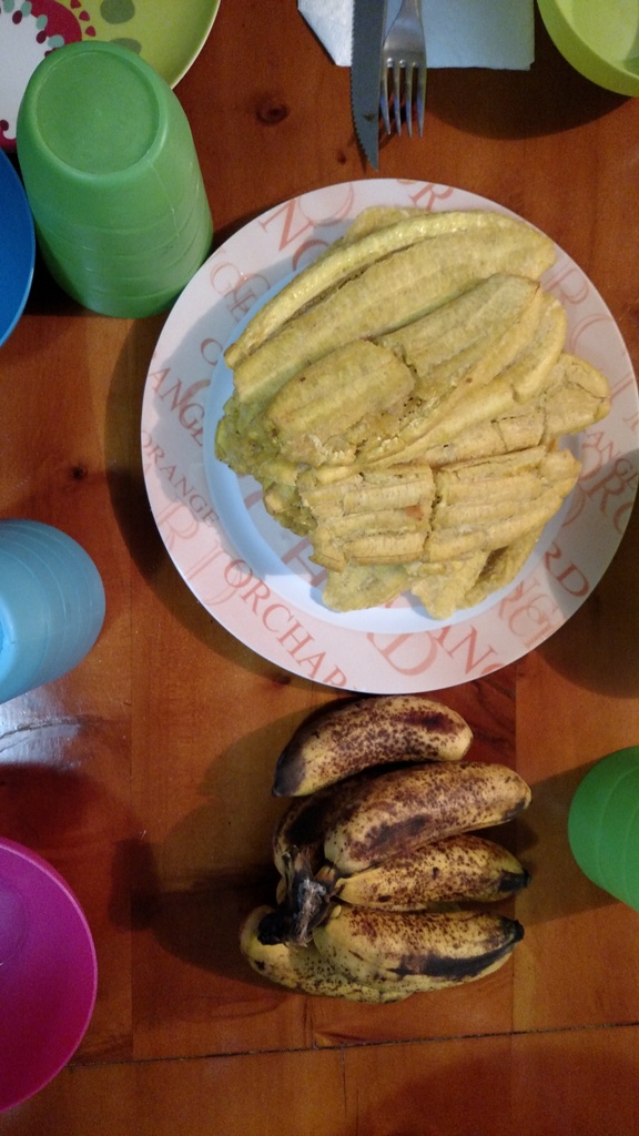 We finished our painting about 4 pm and soon we will be eating Cebiche for dinner. This cold soup is delicious and the second time Carmen has fixed it for us. It has become one of my favorite Ecuadorian dishes. Carmen served us rice, cebiche, patacones and for dessert a small sweet banana. The cebiche was another home run for her. The patacones were hot and tasty, especially with a sprinkle of salt on them. The patacon is a plantain that is cooked till soft and then smashed with a rock and then placed in hot grease for a quick minute to fry it. Delicious!!