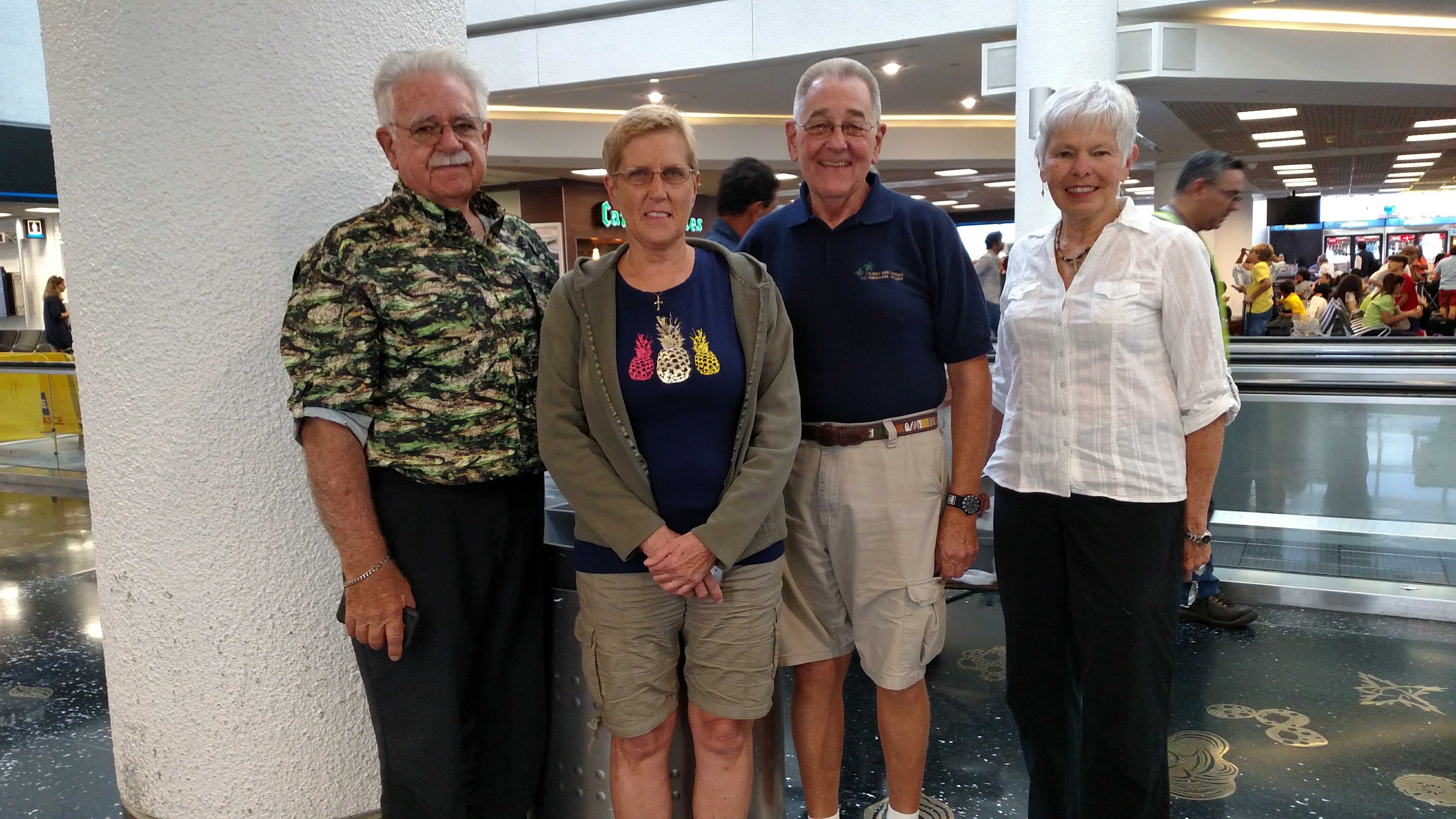 Our connections all went smoothly and we met each other about noon at the American Airlines check in area. At that point we checked in and went through security screening and then grabbed a quick bite to eat and then working our way on to our gate. Our flight was scheduled to leave about 3:25 pm and boarding would start about 45 minutes earlier. We were able to have someone take our picture as we waited for boarding.