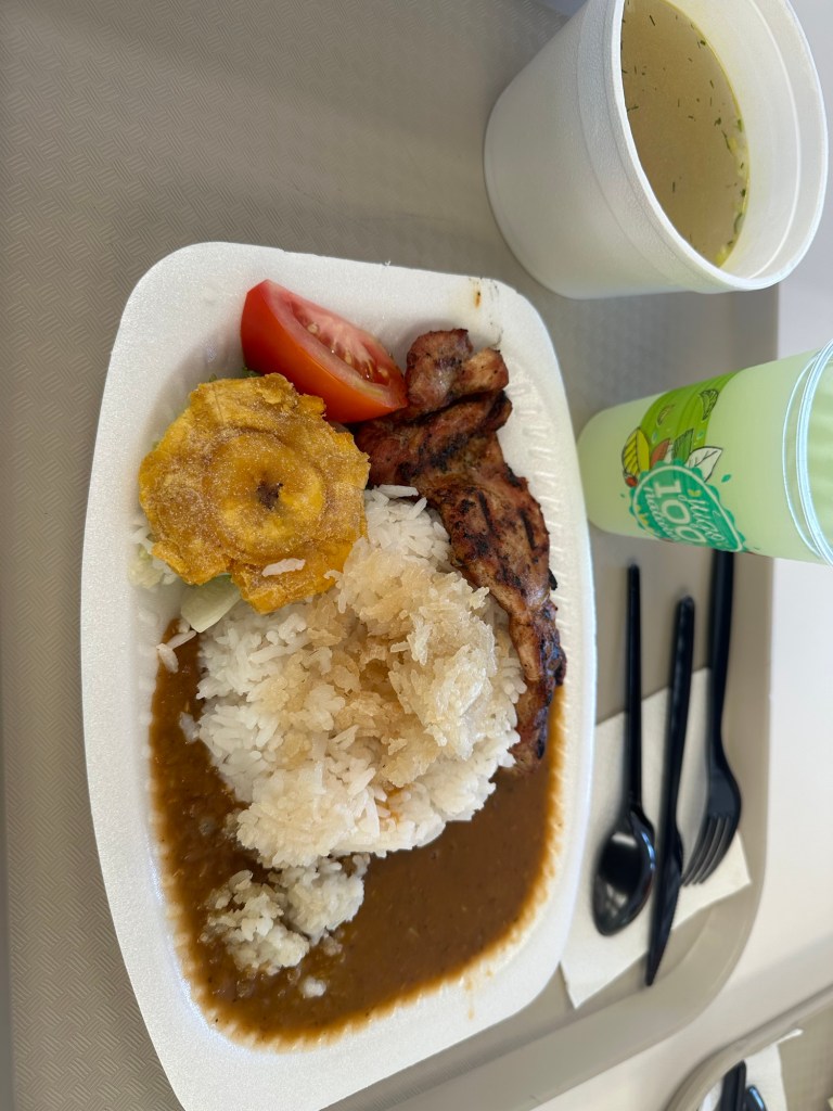 At the mall Claudia wanted to purchase some coffee beans so we went to the SuperMaxi grocery store. Then we went to the food court for lunch. Claudia and I ordered a small grilled chicken fillet thinking that was all we really wanted. What came with that was a large serving of rice and beans, a small salad, soup called chicken soup which was mainly chicken broth with a small amount of rice and a piece of chicken, and lemonade. The cost for all that was $4.25. For a small lunch, it was a lot of food! After we sat and talked for a while Jane asked if we wanted ice cream. Choices were all sorts of fruit flavors. There was chocolate but no vanilla. We all got a serving of mango ice cream. Jane split her serving with mango and Oreo cookie ice cream. The mango was delicious and tasted just like the fresh mango we had plenty of at the clinic.