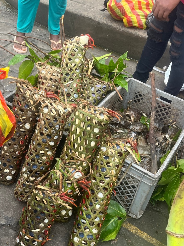 At the market we saw large displays of many different kinds of vegetables that were locally grown and were freshly harvested. There was an abundance of produce at various vendors on displays stretching about two city blocks of distance on both sides of the street. There was also a rather large meat market on one side. The meat market included a lot of fish for sale that included various salt water fish and shrimp of various sizes, prawns, live crabs, and clams. This section was rather smelly because of the fish being out in the warm air with no refrigeration. One man had several huge red snappers that were all at least 25 to 30” in length. I looked at them and tried to imagine the thrill and work involved in reeling one of them in to the boat. Catching fish is a lot of fun when you are working with fish like that.