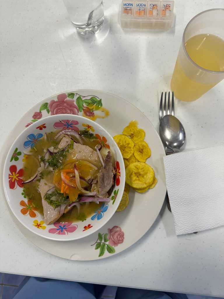We decided to have lunch before starting our second surgery. Our lunch was encebollado, an Ecuadorian favorite. It is yucca, albacore, onions, cilantro, banana chips, covered with a broth with some hot sauce on top and then a lime squeezed over it to lace it with the juice. Delicious! Loida made it especially for me. She showed us the order of adding the ingredients to make the meal.